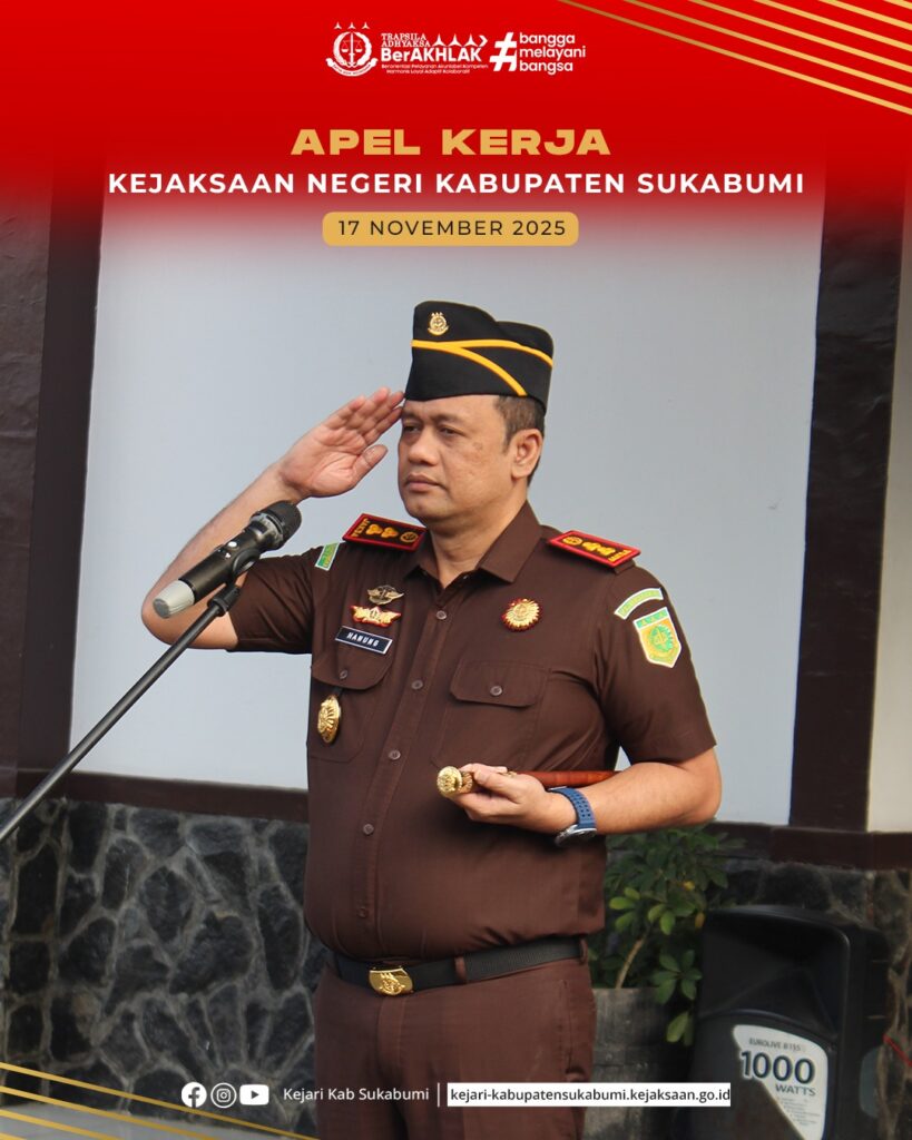 Pada Senin, 17 November 2025, Kejaksaan Negeri Kabupaten Sukabumi melaksanakan Apel Kerja di halaman kantor Kejari. Kegiatan ini dipimpin oleh Kepala Kejaksaan Negeri Kabupaten Sukabumi, Hanung Widyatmaka, S.H., dan diikuti oleh para kepala seksi serta seluruh pegawai.