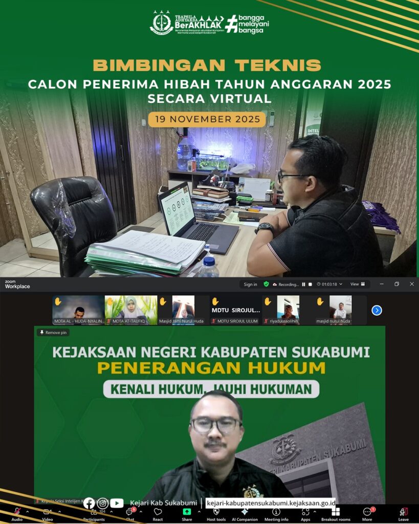 Pada Rabu, 19 November 2025, Kejaksaan Negeri Kabupaten Sukabumi melaksanakan Bimbingan Teknis (Bimtek) bagi Calon Penerima Hibah Tahun Anggaran 2025 secara virtual. Kegiatan yang berlangsung di Ruang Kepala Seksi Intel dan dipimpin oleh Fahmi Rachman, S.H., M.H., ini bertujuan meningkatkan pemahaman peserta mengenai tata kelola, akuntabilitas, serta kepatuhan dalam proses pengelolaan hibah. Melalui Bimtek ini, diharapkan penyaluran hibah dapat berjalan lebih transparan, tepat sasaran, serta sesuai ketentuan yang berlaku.