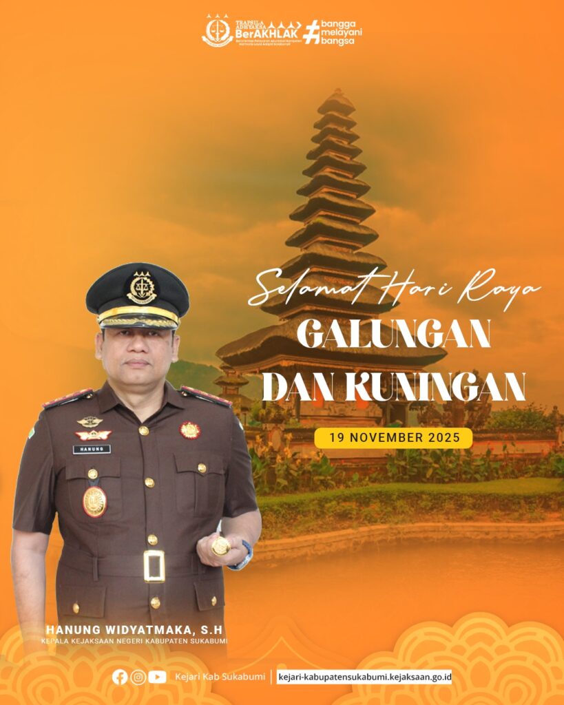 Kepala Kejaksaan Negeri Kabupaten Sukabumi bersama seluruh jajaran menyampaikan ucapan Selamat Hari Raya Galungan dan Kuningan kepada umat Hindu. Peringatan ini menjadi momentum untuk merayakan kemenangan Dharma atas Adharma, sekaligus memperkuat semangat kebhinekaan, persaudaraan, serta harmoni dalam kehidupan bermasyarakat. Melalui pesan ini, Kejari Kabupaten Sukabumi berharap terciptanya kerukunan dan toleransi yang semakin kokoh di tengah masyarakat.