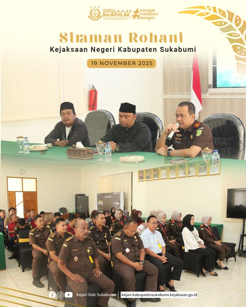 Pada Rabu, 19 November 2025, Kejaksaan Negeri Kabupaten Sukabumi menyelenggarakan kegiatan Siraman Rohani di Aula Kejari. Kegiatan ini bertujuan memperkuat integritas, menumbuhkan ketenangan batin, serta meningkatkan kualitas moral para pegawai dalam menjalankan tugas dan memberikan pelayanan publik. Melalui pembinaan rohani yang berkesinambungan, Kejaksaan RI terus mendorong terbentuknya aparatur yang berakhlak, profesional, dan berkomitmen pada nilai Trapsila Adhyaksa Berakhlak.