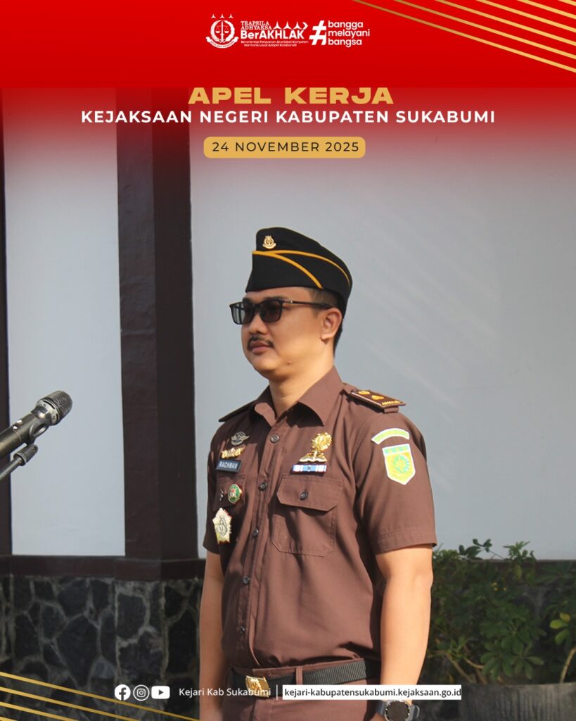 Pada Senin, 24 November 2025, Kejaksaan Negeri Kabupaten Sukabumi melaksanakan Apel Kerja bertempat di halaman kantor. Apel ini dipimpin oleh Kepala Seksi Intelijen, Fahmi Rachman, S.H., M.H., dan diikuti oleh para Kepala Seksi serta seluruh pegawai Kejari Kabupaten Sukabumi. Kegiatan apel rutin ini bertujuan memperkuat kedisiplinan, meningkatkan semangat kerja, serta menyamakan langkah dalam pelaksanaan tugas dan pelayanan publik. Melalui apel pagi yang konsisten, Kejaksaan RI terus mendorong terciptanya kinerja yang profesional, berintegritas, dan sejalan dengan nilai Trapsila Adhyaksa Berakhlak.