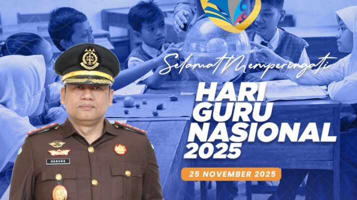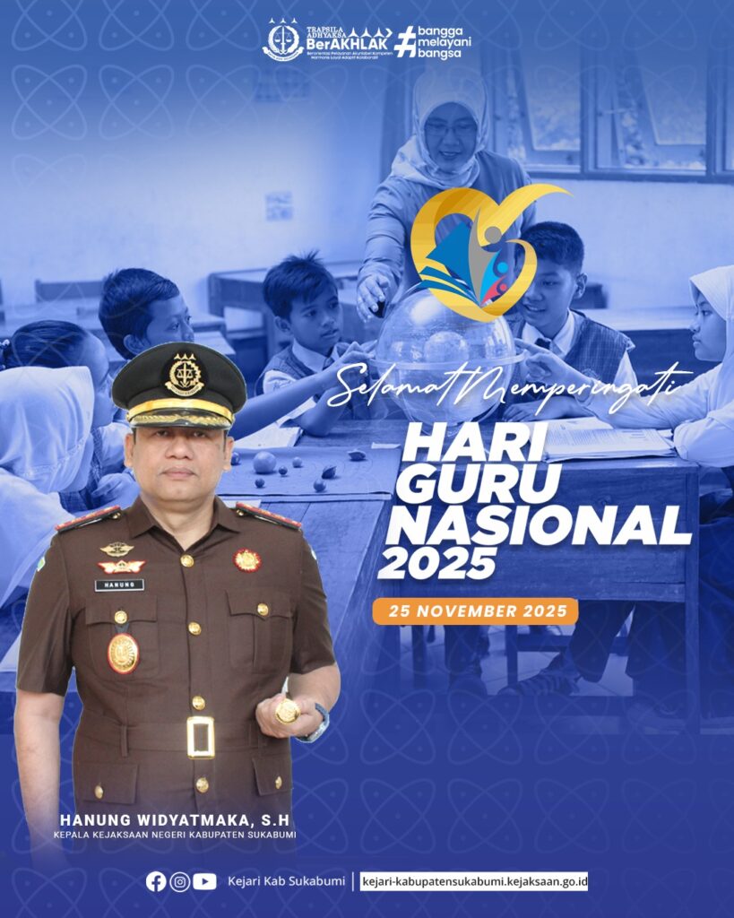 Kepala Kejaksaan Negeri Kabupaten Sukabumi bersama seluruh jajaran menyampaikan ucapan Selamat Hari Guru Nasional sebagai bentuk penghormatan kepada para pendidik di seluruh Indonesia. Melalui pesan resminya, Kejari Kabupaten Sukabumi menyampaikan terima kasih atas dedikasi para guru yang menjadi pelita dalam mencerdaskan kehidupan bangsa. Ucapan ini juga dibagikan melalui kanal resmi kejaksaan sebagai wujud apresiasi serta dukungan terhadap perjuangan para guru dalam membangun generasi berakhlak.