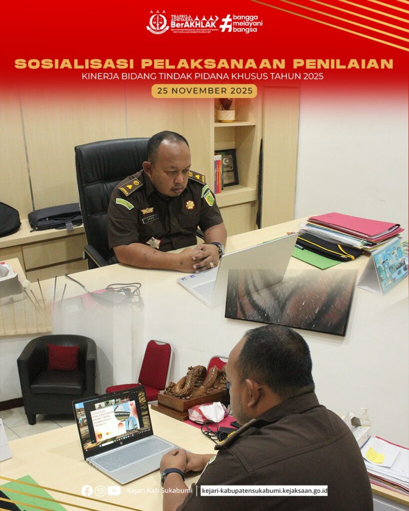 Pada Selasa, 25 November 2025, Kepala Seksi Tindak Pidana Khusus Kejaksaan Negeri Kabupaten Sukabumi, Agus Yuliana Indra Santoso, S.H., M.H., mengikuti Sosialisasi Pelaksanaan Penilaian Kinerja Bidang Tindak Pidana Khusus Tahun 2025 secara virtual. Kegiatan ini digelar sebagai upaya memperkuat komitmen dalam mewujudkan penegakan hukum yang profesional, transparan, dan berintegritas. Melalui sosialisasi ini, diharapkan pelaksanaan tugas di bidang tindak pidana khusus semakin optimal dan mampu memberikan kontribusi signifikan bagi peningkatan kualitas kinerja Kejaksaan.