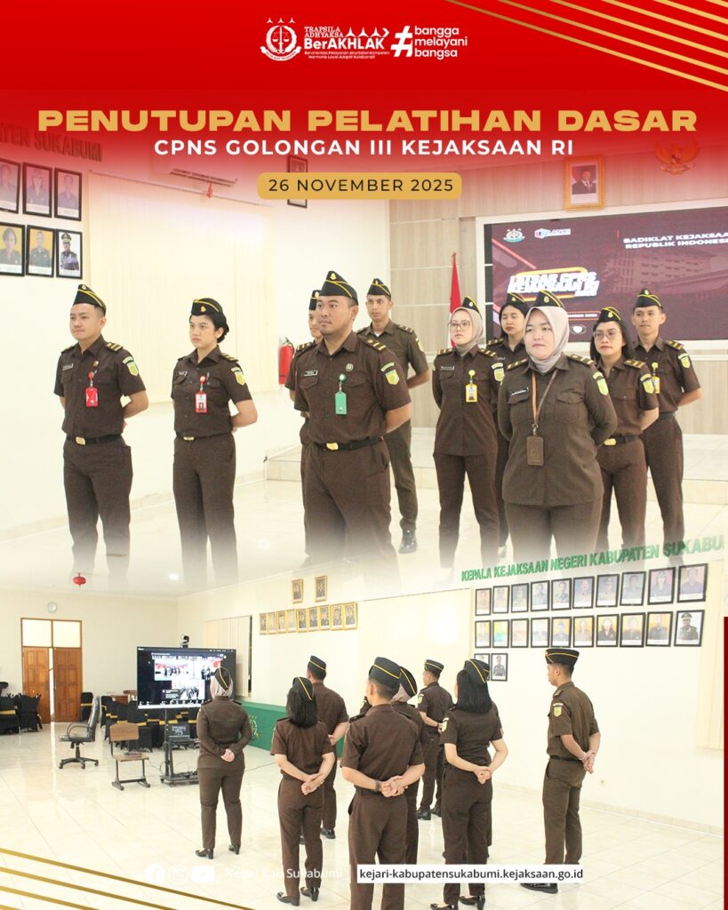 Pada Rabu, 26 November 2025, Kejaksaan Negeri Kabupaten Sukabumi melaksanakan Penutupan Pelatihan Dasar (Latsar) CPNS Golongan III yang digelar secara virtual dan diikuti oleh seluruh peserta CPNS. Kegiatan yang berlangsung di Aula Kejaksaan Negeri Kabupaten Sukabumi ini menjadi momentum penting bagi para calon aparatur untuk meneguhkan komitmen mereka sebagai abdi negara. Penutupan Latsar ini menandai langkah awal pengabdian dengan integritas, profesionalisme, serta ketulusan dalam melayani masyarakat dan mendukung tugas penegakan hukum. Bersama, para CPNS siap mewujudkan ASN BerAKHLAK dan berkontribusi positif bagi kejaksaan.