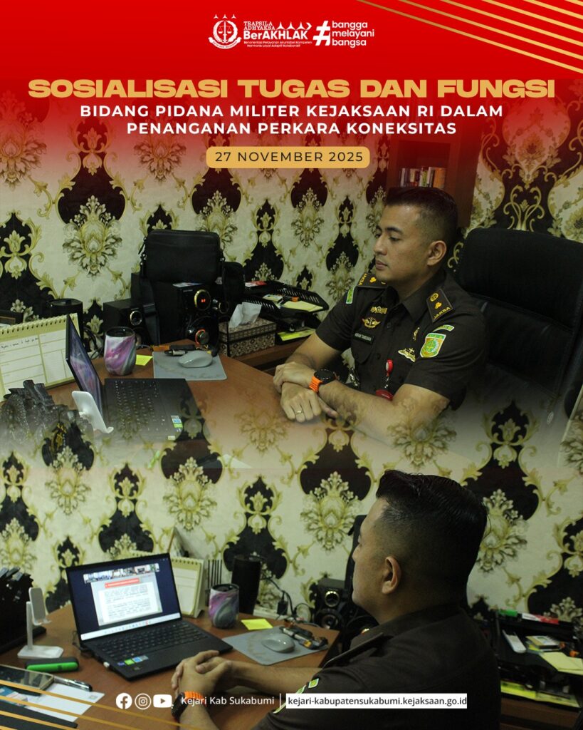 Pada Kamis, 27 November 2025, Kejaksaan Negeri Kabupaten Sukabumi mengikuti sosialisasi tugas dan fungsi Bidang Pidana Militer Kejaksaan RI terkait penanganan perkara koneksitas. Kegiatan yang berlangsung secara virtual ini diikuti oleh Kepala Seksi Tindak Pidana Umum, Abram Nami Putra, S.H., M.H., dan bertempat di ruang Kasi Pidum Kejari Kabupaten Sukabumi. Melalui sosialisasi tersebut, Kejari Kabupaten Sukabumi menegaskan komitmennya untuk terus meningkatkan sinergi, profesionalitas, serta integritas dalam setiap proses penanganan perkara guna mewujudkan penegakan hukum yang berkeadilan.