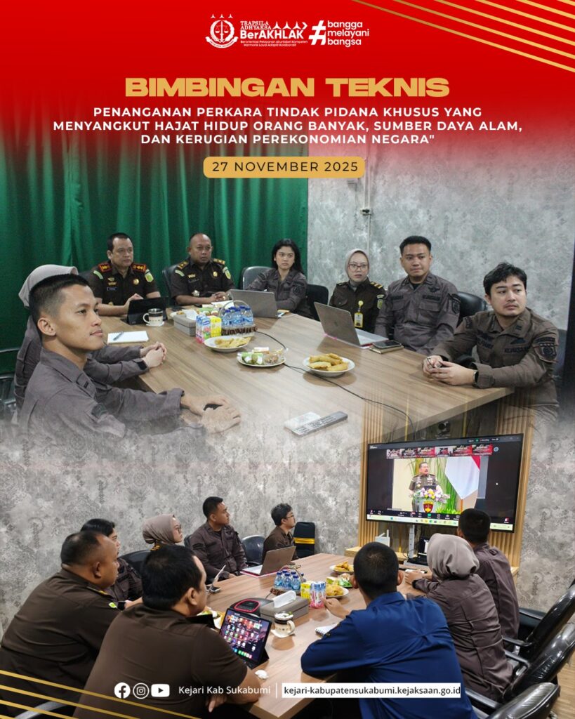 Pada Kamis, 27 November 2025, Kejaksaan Negeri Kabupaten Sukabumi mengikuti Bimbingan Teknis bertema “Arah Kebijakan Jaksa Agung Muda Tindak Pidana Khusus dalam Penanganan Perkara Tindak Pidana Khusus yang Menyangkut Hajat Hidup Orang Banyak, Sumber Daya Alam, dan Kerugian Perekonomian Negara.” Kegiatan yang dilaksanakan secara virtual ini diikuti oleh Kepala Kejaksaan Negeri Kabupaten Sukabumi, Hanung Widyatmaka, S.H., serta Kepala Seksi Tindak Pidana Khusus, Agus Yuliana Indra Santoso, S.H., M.H., dari Ruang Rapat Kejari Kabupaten Sukabumi.