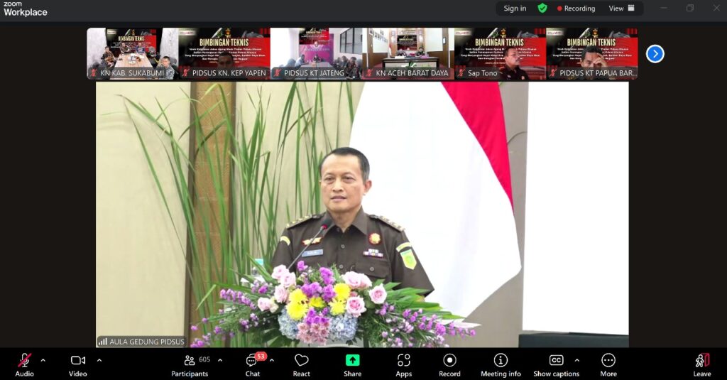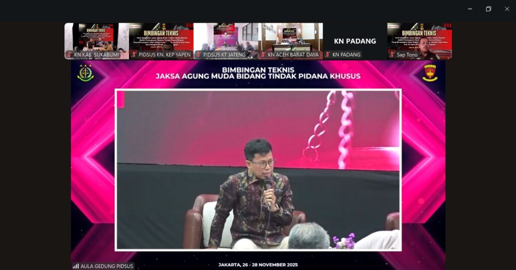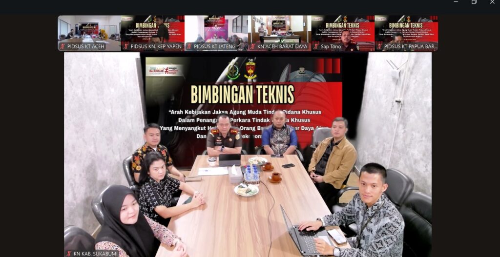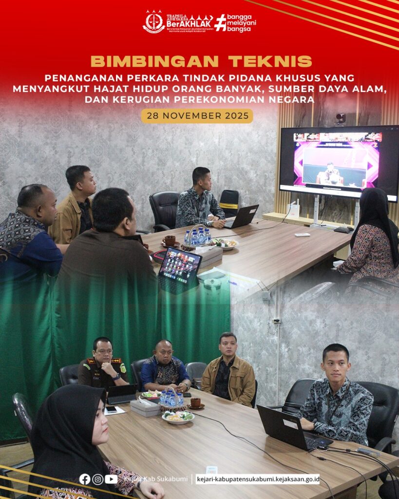 Pada Jumat, 28 November 2025, Kejaksaan Negeri Kabupaten Sukabumi mengikuti Bimbingan Teknis bertema “Arah Kebijakan Jaksa Agung Muda Tindak Pidana Khusus dalam Penanganan Perkara Tindak Pidana Khusus yang Menyangkut Hajat Hidup Orang Banyak, Sumber Daya Alam, dan Kerugian Perekonomian Negara.” Kegiatan yang dilaksanakan secara virtual dari Ruang Rapat Kejari ini diikuti oleh Kepala Kejaksaan Negeri Kabupaten Sukabumi, Hanung Widyatmaka, S.H., serta Kepala Seksi Tindak Pidana Khusus, Agus Yuliana Indra Santoso, S.H., M.H.