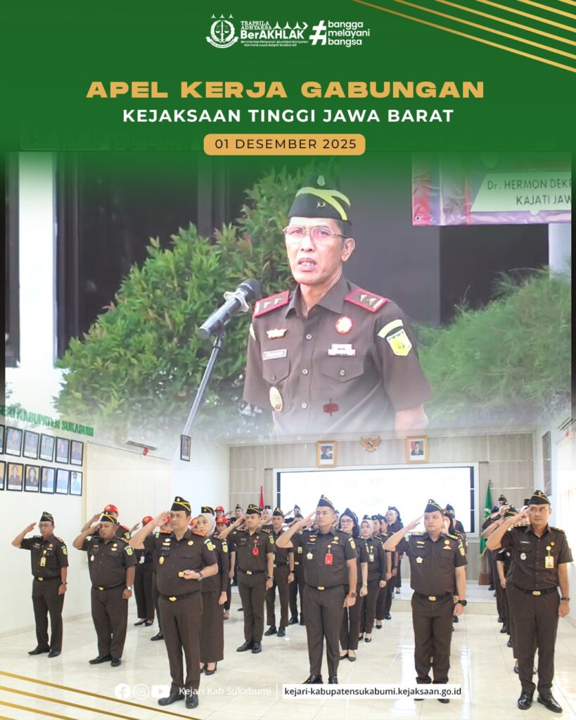 Pada Senin, 1 Desember 2025, Kejaksaan Negeri Kabupaten Sukabumi mengikuti Apel Gabungan Kejaksaan Tinggi Jawa Barat dan Kejaksaan Negeri se-Jawa Barat yang digelar secara virtual. Kegiatan yang berlangsung di Aula Kejari Kabupaten Sukabumi ini dihadiri oleh Kepala Kejaksaan Negeri Kabupaten Sukabumi, Hanung Widyatmaka, S.H., para Kepala Seksi, serta seluruh pegawai Kejari.