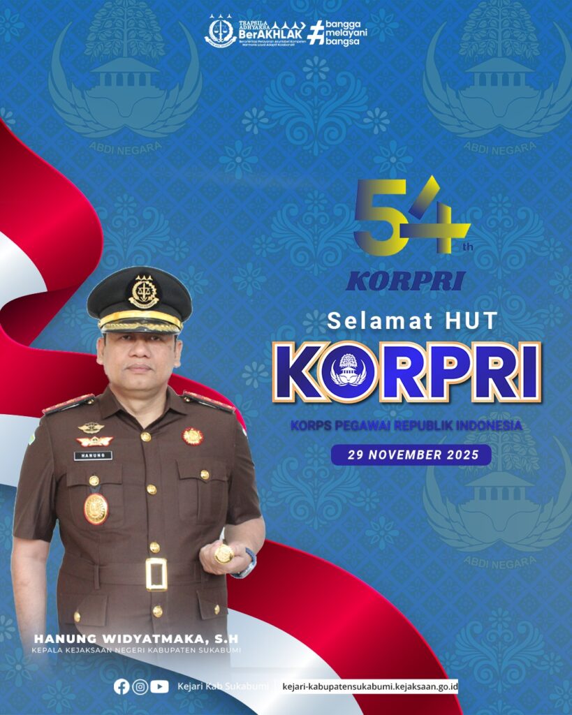 Kepala Kejaksaan Negeri Kabupaten Sukabumi bersama seluruh jajaran menyampaikan ucapan Selamat Hari Ulang Tahun Korps Pegawai Republik Indonesia (KORPRI). Pada momentum peringatan ini, Kejari Kabupaten Sukabumi berharap KORPRI terus menjadi garda terdepan dalam mewujudkan birokrasi yang profesional, bersih, dan berorientasi pelayanan.