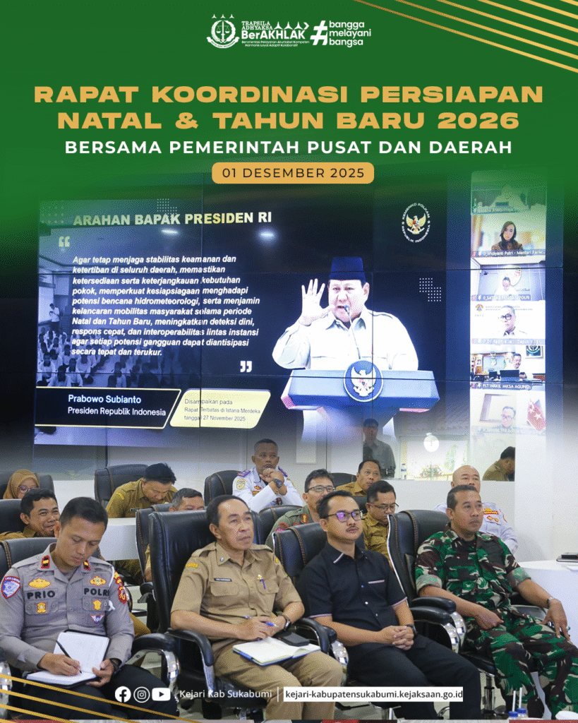 Pada Senin, 1 Desember 2025, Kejaksaan Negeri Kabupaten Sukabumi melalui Kepala Seksi Intelijen, Fahmi Rachman, S.H., M.H., menghadiri Rapat Koordinasi Persiapan Natal 2025 dan Tahun Baru 2026 yang diselenggarakan secara virtual dari Command Center Kabupaten Sukabumi. Rapat ini merupakan bentuk sinergi antara Pemerintah Pusat dan Daerah untuk memastikan keamanan, kenyamanan, serta kelancaran perayaan masyarakat menjelang momentum Nataru.