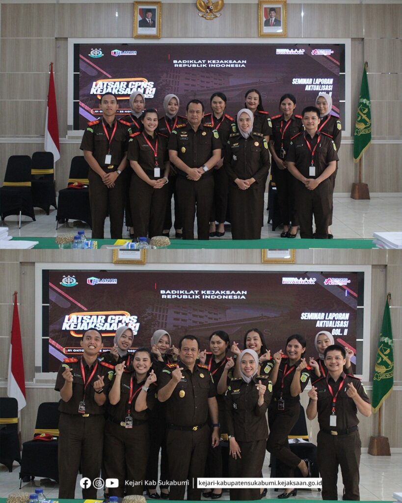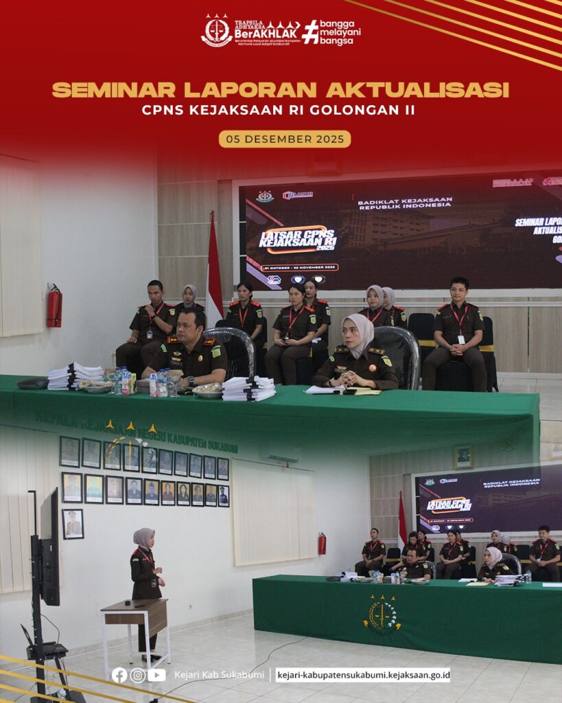 Sukabumi – Senin, 8 Desember 2025. Bertempat di Aula Kejaksaan Negeri Kabupaten Sukabumi telah dilaksanakan kegiatan Penutupan Pelatihan Dasar (Latsar) CPNS Golongan II Kejaksaan Republik Indonesia yang berlangsung secara virtual. Kegiatan ini diikuti oleh seluruh peserta CPNS Golongan II yang berasal dari satuan kerja Kejaksaan Negeri Kabupaten Sukabumi.