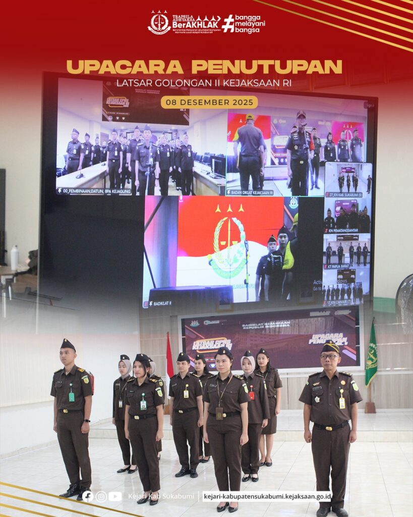 Senin, 8 Desember 2025 — Sukabumi. Bertempat di Aula Kejaksaan Negeri Kabupaten Sukabumi, telah dilaksanakan Penutupan Pelatihan Dasar (Latsar) CPNS Golongan II Kejaksaan Republik Indonesia yang diselenggarakan secara virtual. Kegiatan ini diikuti oleh seluruh CPNS Golongan II yang telah menyelesaikan rangkaian pelatihan dasar sebagai persyaratan awal untuk menjalankan tugas sebagai Aparatur Sipil Negara di lingkungan Kejaksaan.
