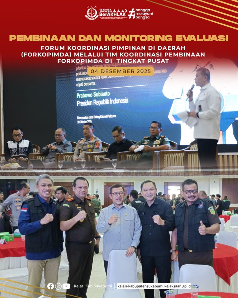 Kepala Kejaksaan Negeri Kabupaten Sukabumi, Hanung Widyatmaka, S.H., menghadiri kegiatan Pembinaan serta Monitoring dan Evaluasi Forum Koordinasi Pimpinan di Daerah (Forkopimda) yang diselenggarakan oleh Tim Koordinasi Pembinaan Forkopimda Tingkat Pusat, Kamis (4/12/2025), bertempat di Gedung Mohamad Tiha Komplek Pemda Kabupaten Bandung. Kegiatan ini bertujuan memperkuat koordinasi, sinergi, dan stabilitas penyelenggaraan pemerintahan daerah dalam rangka mendukung terciptanya tata kelola pemerintahan yang efektif, responsif, dan berpihak kepada kepentingan masyarakat.