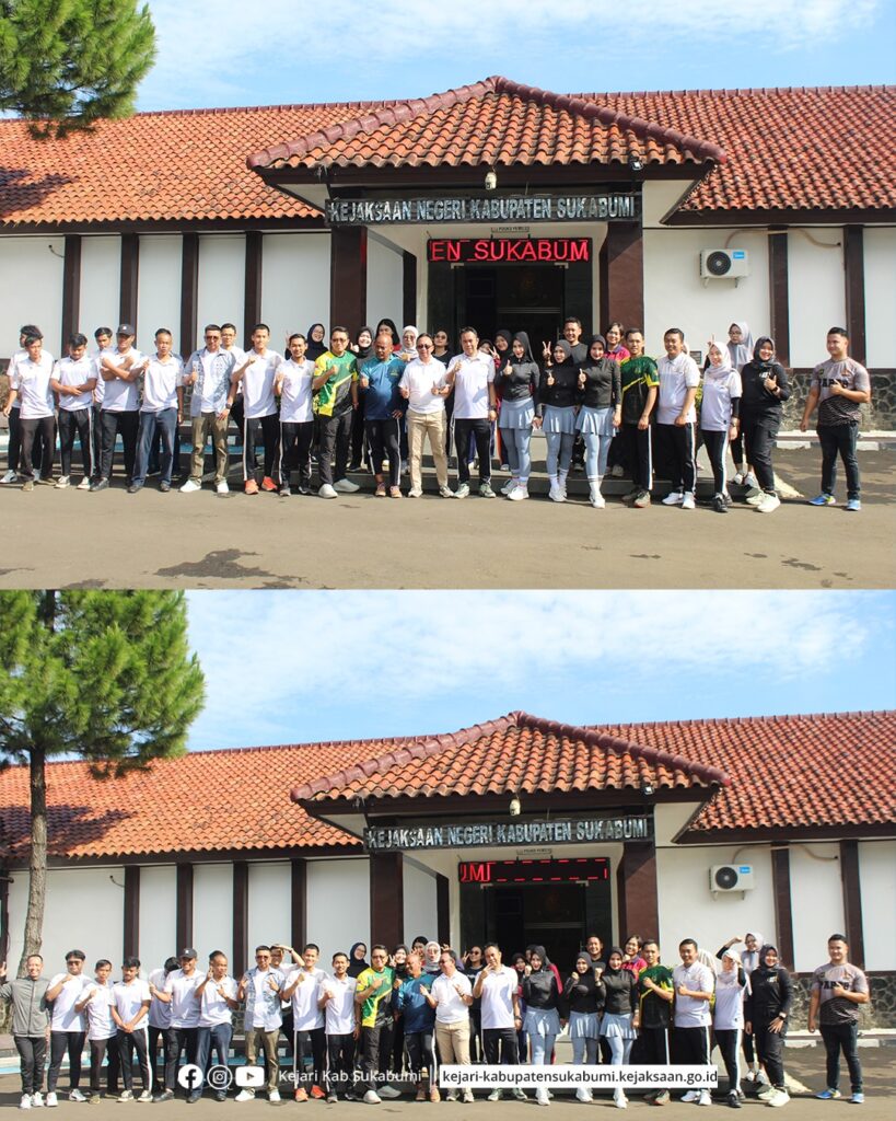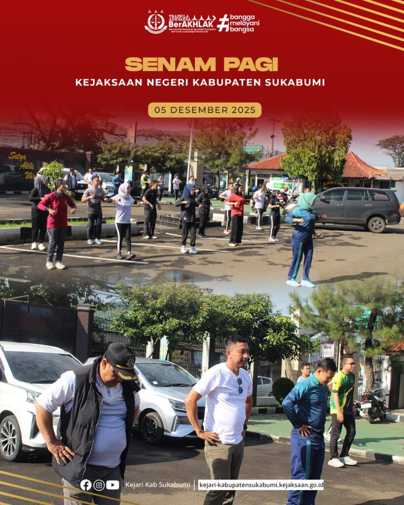 Jumat, 5 Desember 2025 – Kejaksaan Negeri Kabupaten Sukabumi melaksanakan kegiatan senam pagi bersama bertempat di halaman kantor Kejaksaan. Kegiatan tersebut diikuti oleh Kepala Kejaksaan Negeri Kabupaten Sukabumi, Hanung Widyatmaka, S.H., para Kepala Seksi, serta seluruh pegawai. Pelaksanaan senam ini menjadi salah satu upaya menjaga kebugaran, mempererat kebersamaan, sekaligus meningkatkan produktivitas kerja dalam mendukung profesionalisme dan pelayanan publik.