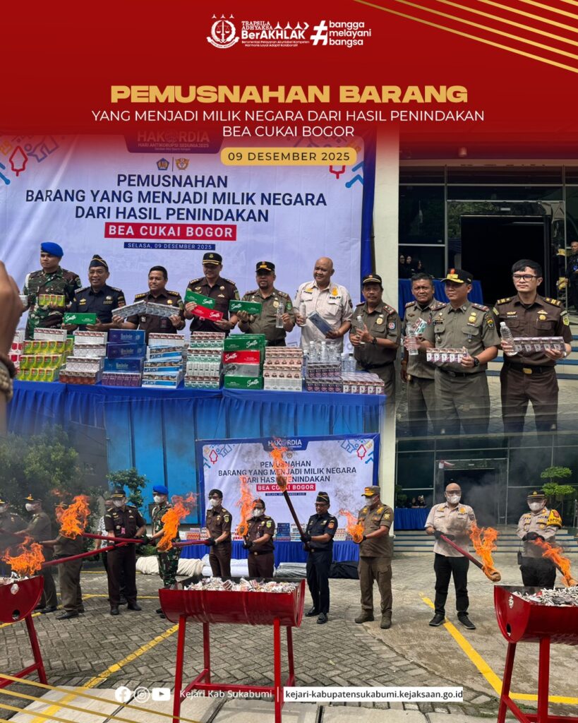 Selasa, 9 Desember 2025 – Bertempat di Kantor Pengawasan dan Pelayanan Bea dan Cukai Tipe Madya Pabean Bogor, Jaksa Fungsional Kejaksaan Negeri Kabupaten Sukabumi, Recky Reynaldo Ginting, S.H., menghadiri kegiatan pemusnahan barang yang menjadi milik negara dari hasil penindakan Bea Cukai Bogor. Kegiatan ini merupakan bentuk komitmen bersama dalam penegakan hukum serta pemberantasan peredaran barang ilegal demi melindungi masyarakat, industri dalam negeri, serta menjaga stabilitas perekonomian regional dan nasional.