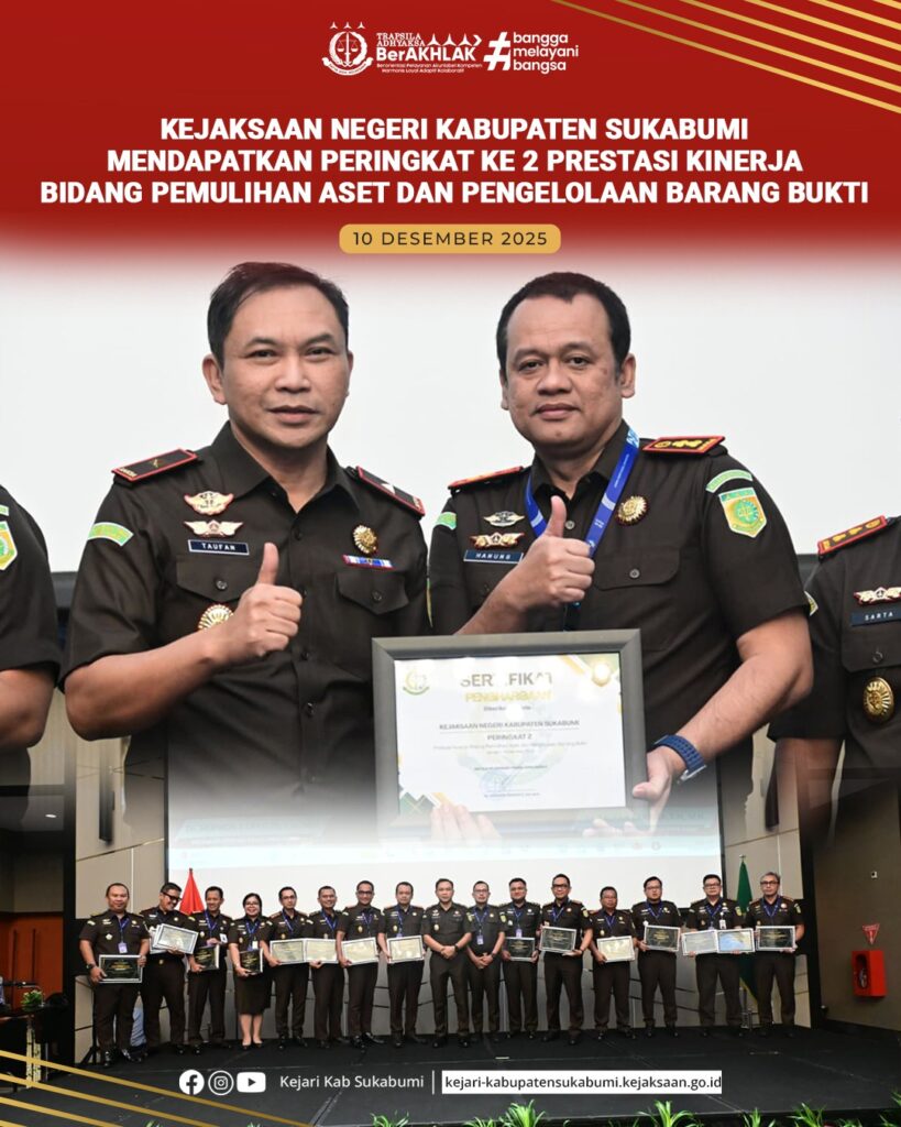 Kejaksaan Negeri Kabupaten Sukabumi berhasil meraih peringkat ke-2 Prestasi Kinerja Bidang Pemulihan Aset dan Pengelolaan Barang Bukti pada Rapat Kerja Daerah Kejaksaan Tinggi Jawa Barat. Pencapaian ini mencerminkan komitmen Kejari Kabupaten Sukabumi dalam meningkatkan kualitas kinerja, profesionalisme, serta efektivitas penegakan hukum khususnya dalam pengelolaan barang bukti dan pemulihan aset.