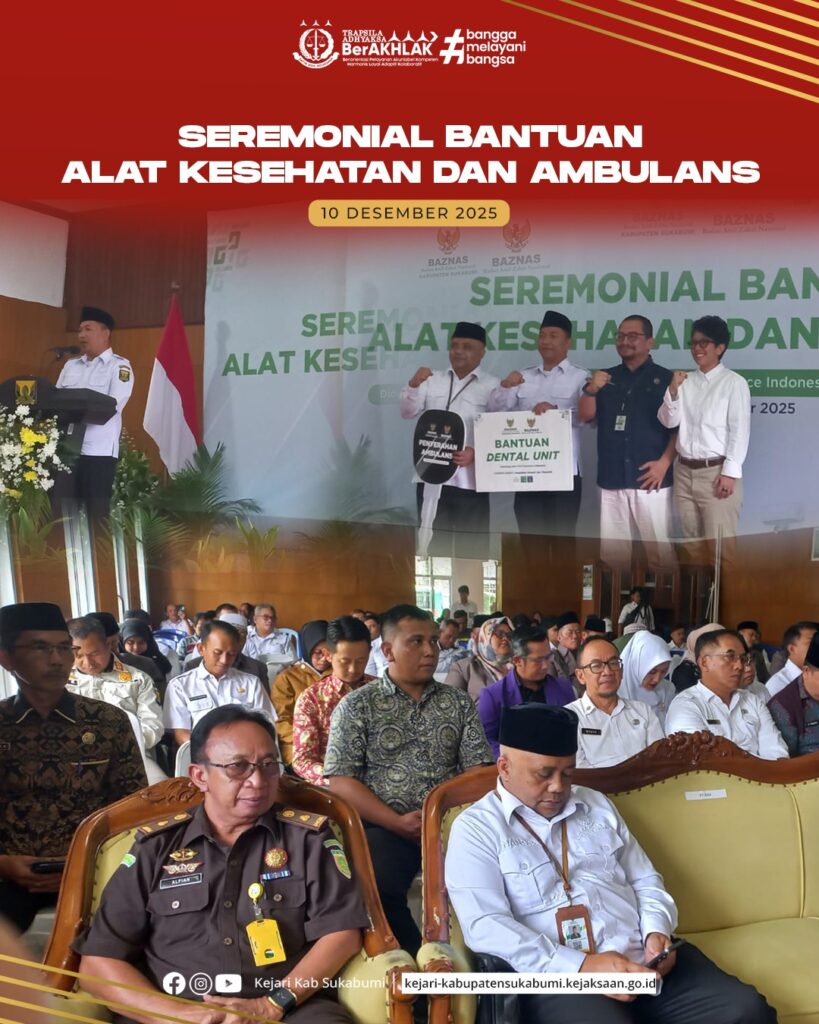 Rabu, 10 Desember 2025 — Jaksa Fungsional Kejaksaan Negeri Kabupaten Sukabumi, Alfian, S.H., M.H., menghadiri kegiatan seremonial penyerahan bantuan alat kesehatan dan satu unit ambulans yang diselenggarakan oleh Baznas Kabupaten Sukabumi dengan dukungan PT AXA Insurance Indonesia. Bantuan ambulans tersebut merupakan kontribusi dari Baznas RI melalui PT AXA Insurance sebagai bagian dari program layanan kemanusiaan yang ditujukan untuk meningkatkan akses masyarakat terhadap fasilitas kesehatan.