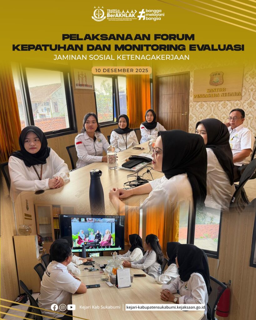 Rabu, 10 Desember 2025 — Bidang Perdata dan Tata Usaha Negara (Datun) Kejaksaan Negeri Kabupaten Sukabumi mengikuti secara virtual kegiatan Forum Kepatuhan dan Monitoring Evaluasi Jaminan Sosial Ketenagakerjaan. Kegiatan ini merupakan bagian dari upaya nasional untuk memastikan implementasi program jaminan sosial ketenagakerjaan berjalan optimal, tepat sasaran, dan sesuai dengan peraturan perundang-undangan yang berlaku.