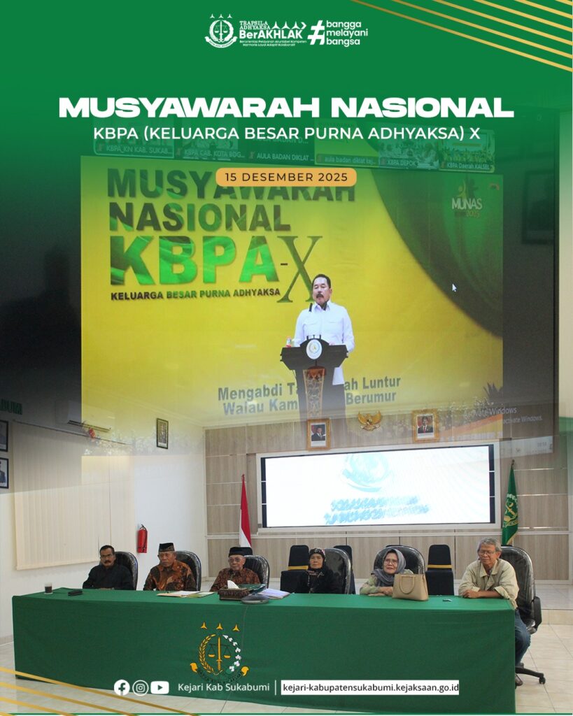 Senin, 15 Desember 2025 — Bertempat di Aula Kejaksaan Negeri Kabupaten Sukabumi, Keluarga Besar Purna Adhyaksa (KBPA) Kejaksaan Negeri Kabupaten Sukabumi mengikuti secara virtual Musyawarah Nasional (Munas) KBPA ke-X. Kegiatan nasional ini menjadi momentum penting bagi para purna adhyaksa untuk mempererat silaturahmi, memperkuat soliditas organisasi, serta merumuskan arah dan program kerja KBPA ke depan.