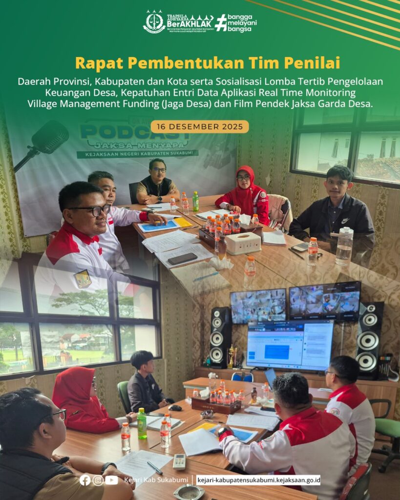 Selasa, 16 Desember 2025 — Bertempat di Kejaksaan Negeri Kabupaten Sukabumi, telah dilaksanakan Rapat Pembentukan Tim Penilai Daerah Provinsi, Kabupaten, dan Kota yang dirangkaikan dengan Sosialisasi Lomba Tertib Pengelolaan Keuangan Desa, Kepatuhan Entri Data Aplikasi Real Time Monitoring Village Management Funding (Jaga Desa), serta Lomba Film Pendek Jaksa Garda Desa. Kegiatan ini menjadi bagian dari upaya nasional dalam mendorong tata kelola keuangan desa yang tertib, akuntabel, dan transparan.