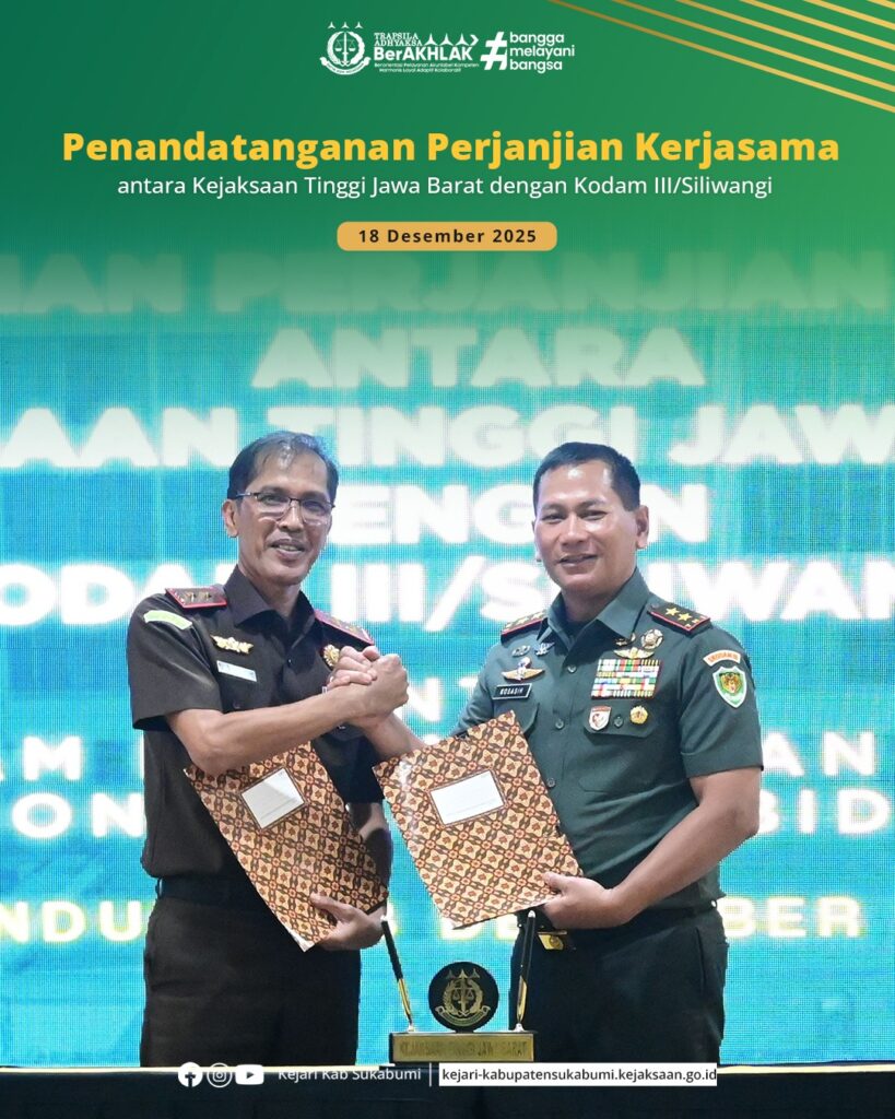 Kamis, 18 Desember 2025 — Kepala Kejaksaan Negeri Kabupaten Sukabumi, Hanung Widyatmaka, S.H., menghadiri kegiatan Penandatanganan Perjanjian Kerja Sama antara Kejaksaan Tinggi Jawa Barat dengan Komando Daerah Militer (Kodam) III/Siliwangi tentang kerja sama dalam pemanfaatan sumber daya dan peningkatan profesionalisme di bidang penegakan hukum. Kegiatan tersebut dilaksanakan di Aula Kejaksaan Tinggi Jawa Barat.