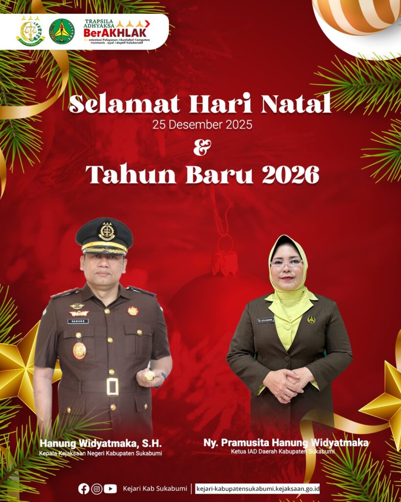 Kepala Kejaksaan Negeri Kabupaten Sukabumi bersama Ketua Ikatan Adhyaksa Dharmakarini (IAD) Daerah Kabupaten Sukabumi beserta seluruh jajaran menyampaikan ucapan Selamat Hari Natal, 25 Desember 2025, dan Tahun Baru 2026 kepada seluruh umat Kristiani serta masyarakat pada umumnya.