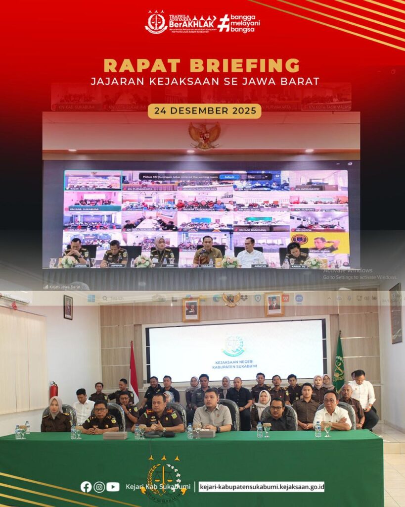Pada hari Rabu, 24 Desember 2025, Kepala Kejaksaan Negeri Kabupaten Sukabumi didampingi para Kepala Seksi beserta seluruh jajaran mengikuti kegiatan Rapat Briefing Jajaran Kejaksaan Se-Jawa Barat yang dilaksanakan secara virtual. Kegiatan tersebut diikuti dari Aula Kejaksaan Negeri Kabupaten Sukabumi.