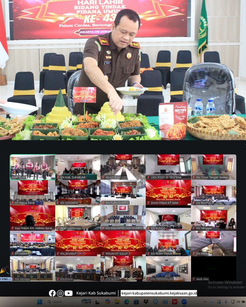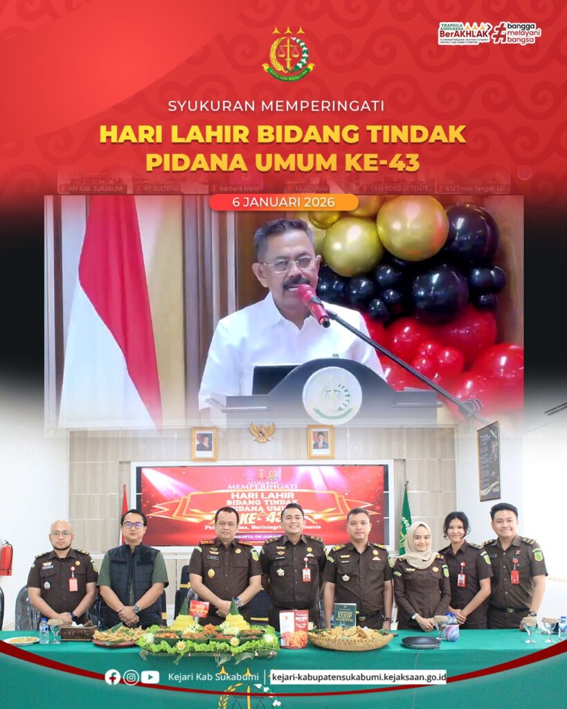 Bertempat di Aula Kejaksaan Negeri Kabupaten Sukabumi, pada Selasa, 6 Januari 2025, telah dilaksanakan kegiatan Syukuran dalam rangka memperingati Hari Lahir Bidang Tindak Pidana Umum ke-43. Kegiatan tersebut diikuti oleh Kepala Kejaksaan Negeri Kabupaten Sukabumi Hanung Widyatmaka, S.H., para Kepala Seksi, Kepala Sub Seksi, serta para Jaksa Kejaksaan Negeri Kabupaten Sukabumi.