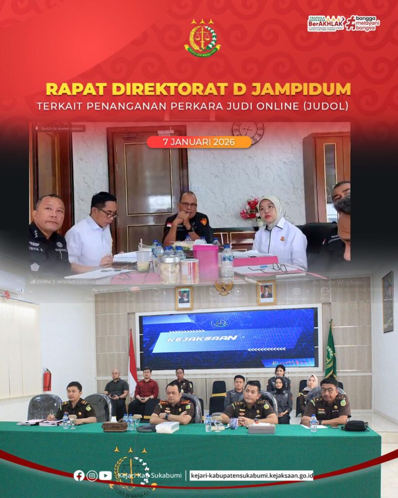 Kejaksaan Negeri Kabupaten Sukabumi berkomitmen untuk terus meningkatkan kinerja serta sinergi antarbidang dalam mendukung upaya pemberantasan tindak pidana judi online, sejalan dengan semangat Trapsila Adhyaksa BerAKHLAK dan penguatan peran Kejaksaan sebagai Jaksa Sahabat Masyarakat.
