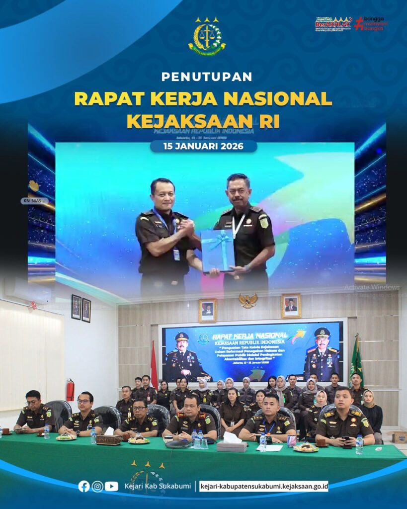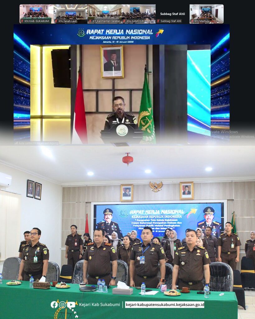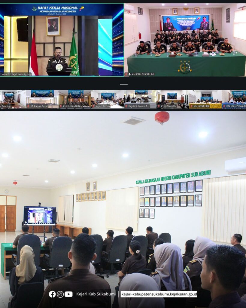 Bertempat di Aula Kejaksaan Negeri Kabupaten Sukabumi, Kepala Kejaksaan Negeri Kabupaten Sukabumi Hanung Widyatmaka, S.H., bersama para Kepala Seksi (Kasi) dan seluruh jajaran Kejaksaan Negeri Kabupaten Sukabumi, mengikuti kegiatan Penutupan Rapat Kerja Nasional (Rakernas) Kejaksaan Republik Indonesia Tahun 2026.