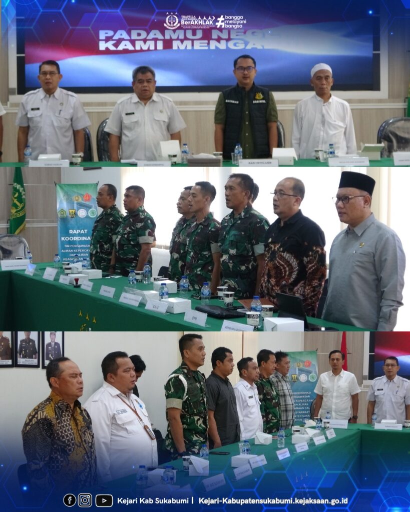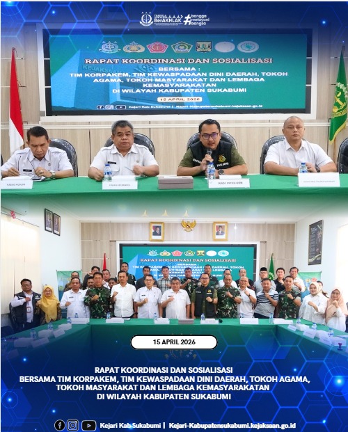 Kejaksaan Negeri Kabupaten Sukabumi menyelenggarakan kegiatan Rapat Koordinasi dan Sosialisasi bersama Tim KORPAKEM (Koordinasi Pengawasan Aliran Kepercayaan dan Keagamaan dalam Masyarakat), Tim Kewaspadaan Dini Daerah, tokoh agama, tokoh masyarakat, serta berbagai lembaga kemasyarakatan di wilayah Kabupaten Sukabumi.