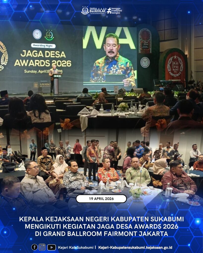 Kepala Kejaksaan Negeri Kabupaten Sukabumi menghadiri malam penganugerahan “Jaga Desa Awards 2026” yang diselenggarakan di Fairmont Jakarta, tepatnya di Grand Ballroom.