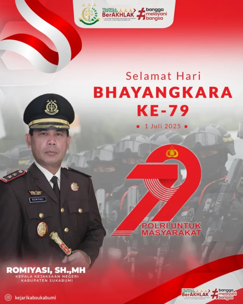 Dalam rangka memperingati Hari Bhayangkara ke-79, Kepala Kejaksaan Negeri Kabupaten Sukabumi, Romiyasi, S.H., M.H., beserta seluruh jajaran menyampaikan ucapan selamat dan apresiasi yang setinggi-tingginya kepada Kepolisian Negara Republik Indonesia atas dedikasi dan pengabdiannya dalam menjaga keamanan, ketertiban, serta memberikan pelayanan terbaik kepada masyarakat.