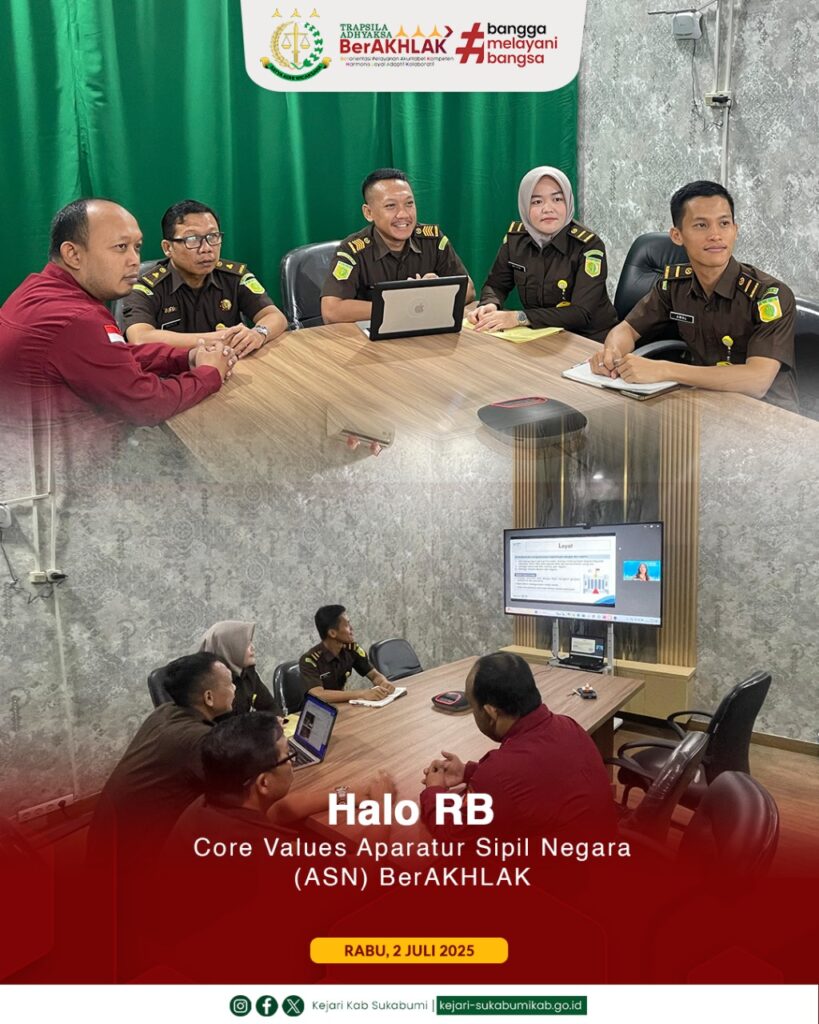 Rabu, 2 Juli 2025 – Dalam rangka mendukung penguatan budaya kerja di lingkungan aparatur pemerintahan, Kasubagbin Kejaksaan Negeri Kabupaten Sukabumi, Muchlis Nurhakim, S.H., bersama Kasi Tindak Pidana Khusus, Agus Yuliana Indra Santoso, S.H., M.H., serta jajaran, mengikuti secara virtual kegiatan “Halo RB Core Values Aparatur Sipil Negara (ASN) BerAKHLAK”.