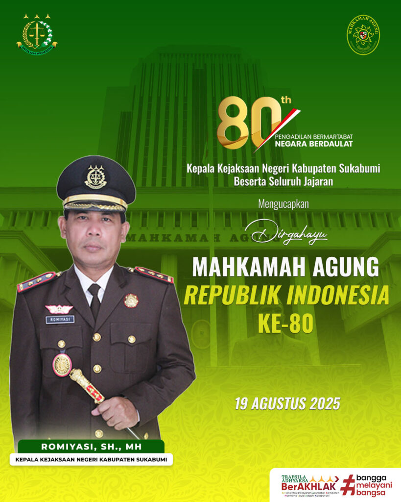 Kepala Kejaksaan Negeri Kabupaten Sukabumi beserta seluruh jajaran menyampaikan ucapan selamat memperingati Hari Ulang Tahun Mahkamah Agung Republik Indonesia ke-80. Dengan mengusung tema “Pengadilan Bermartabat, Negara Berdaulat”, momentum ini diharapkan semakin memperkuat sinergi antar-aparat penegak hukum dalam mewujudkan peradilan yang berkeadilan, profesional, serta berintegritas demi tegaknya kedaulatan hukum di Indonesia.
