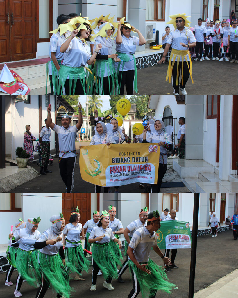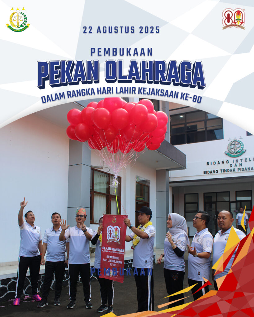 Jumat, 22 Agustus 2025, Kejaksaan Negeri Kabupaten Sukabumi resmi membuka kegiatan Pekan Olahraga (POR) dalam rangka memperingati Hari Lahir Kejaksaan ke-80. Acara pembukaan berlangsung meriah dengan penampilan drumband, parade defile dari masing-masing bidang, serta pelepasan balon ke udara sebagai simbol dimulainya rangkaian kegiatan POR. Melalui ajang ini, diharapkan dapat mempererat silaturahmi, menumbuhkan sportivitas, dan meningkatkan semangat kebersamaan seluruh jajaran Adhyaksa.