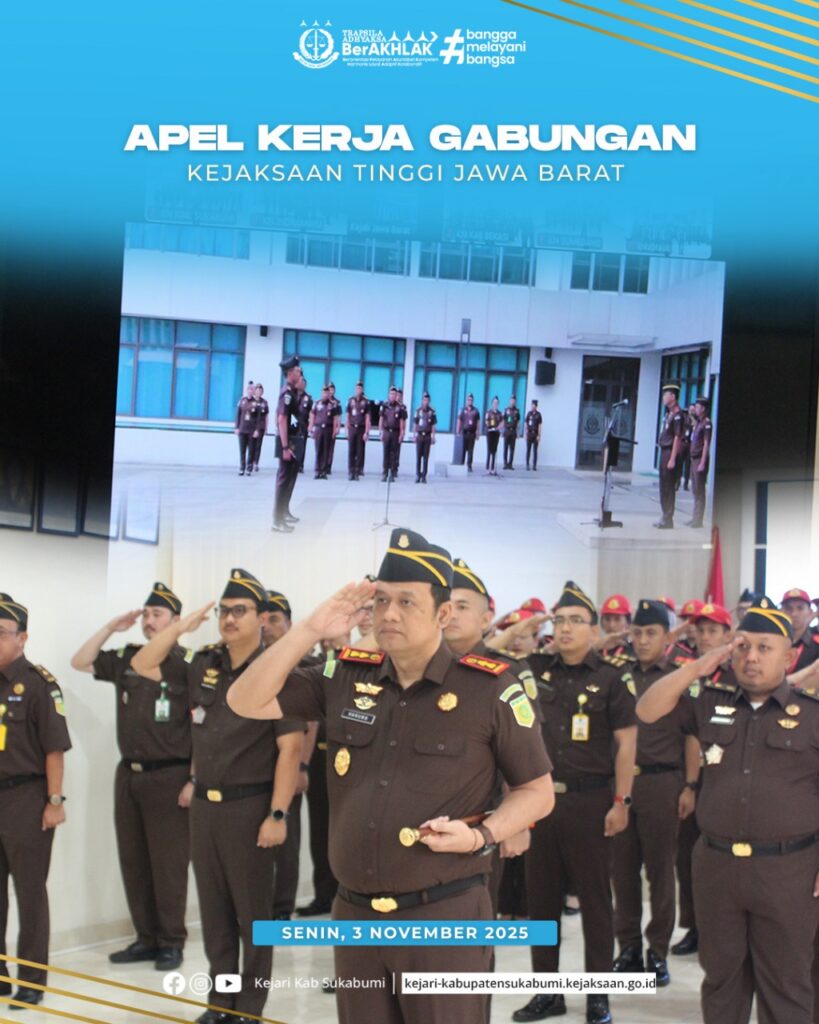 Senin, 3 November 2025 — Bertempat di Aula Kejaksaan Negeri Kabupaten Sukabumi, seluruh pegawai mengikuti Apel Kerja Gabungan secara virtual yang dipimpin oleh Wakil Kepala Kejaksaan Tinggi Jawa Barat, Dr. Taufan Zakaria, S.H., M.H.