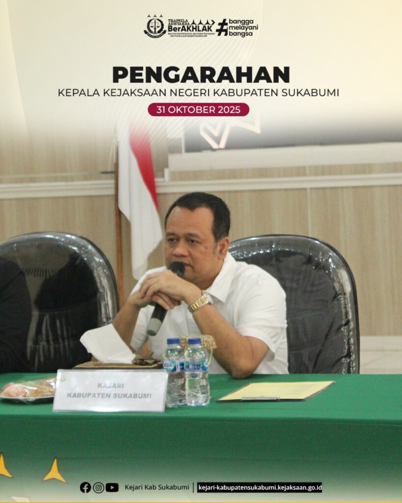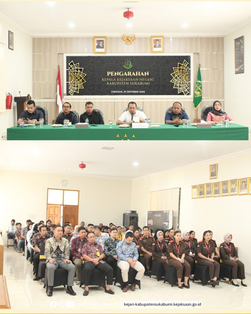 Jumat, 31 Oktober 2025 — Bertempat di Aula Kejaksaan Negeri Kabupaten Sukabumi, Kepala Kejaksaan Negeri Kabupaten Sukabumi, Hanung Widyatmaka, S.H., memberikan pengarahan kepada seluruh Jaksa dan Pegawai Kejaksaan Negeri Kabupaten Sukabumi.