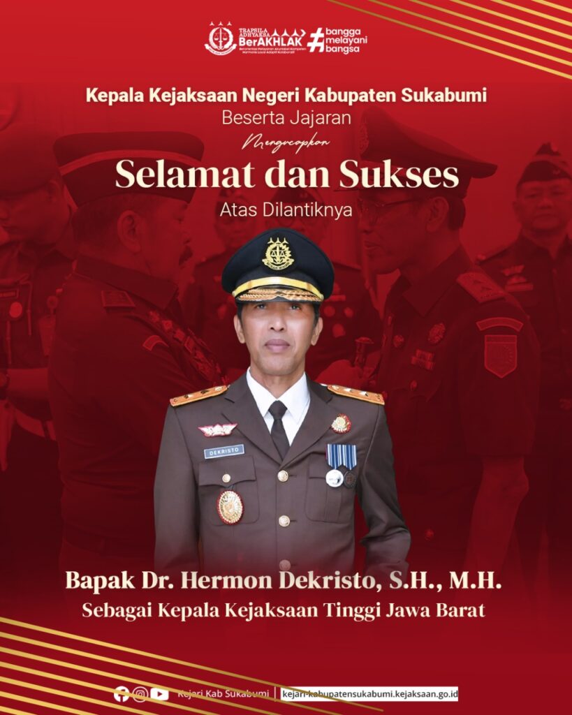 Kepala Kejaksaan Negeri Kabupaten Sukabumi beserta seluruh jajaran mengucapkan Selamat dan Sukses atas dilantiknya Bapak Dr. Hermon Dekristo, S.H., M.H. sebagai Kepala Kejaksaan Tinggi Jawa Barat.