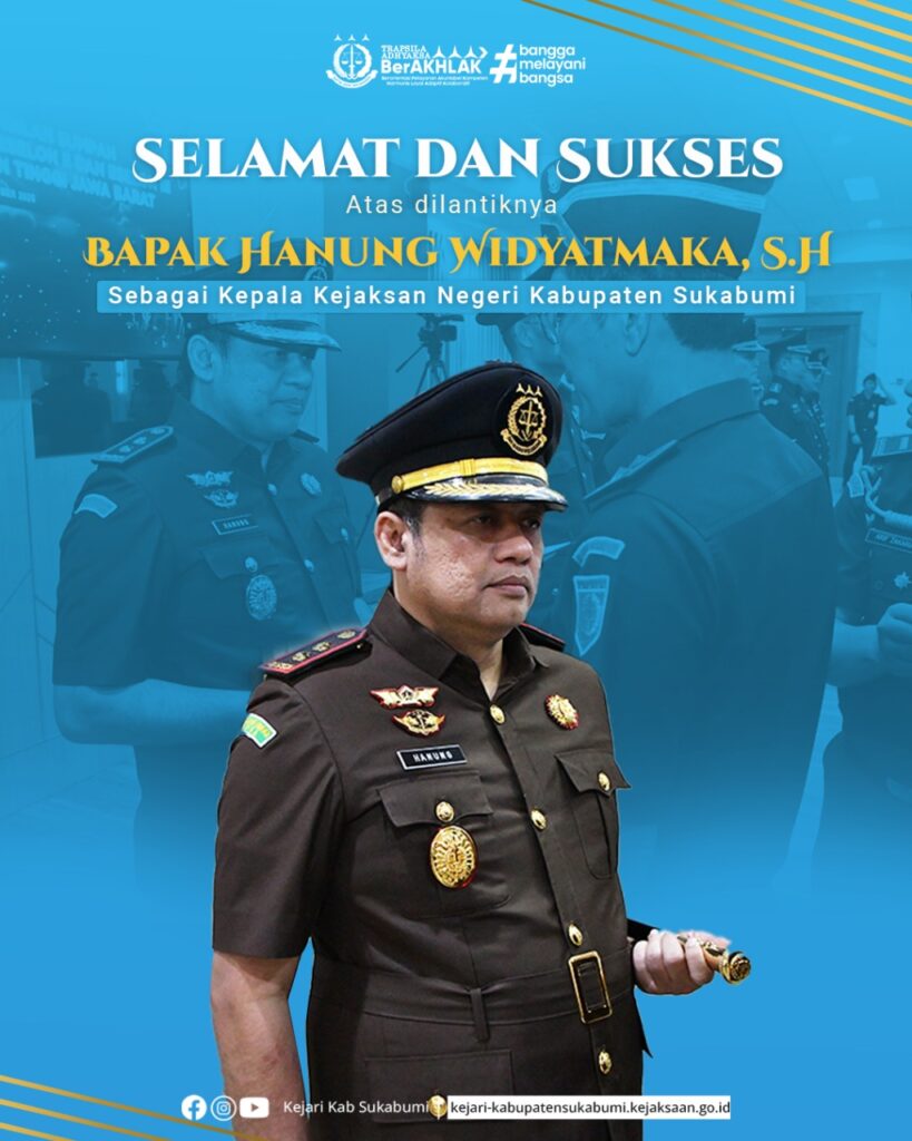 Keluarga besar Kejaksaan Negeri Kabupaten Sukabumi mengucapkan Selamat dan Sukses atas dilantiknya Bapak Hanung Widyatmaka, S.H. sebagai Kepala Kejaksaan Negeri Kabupaten Sukabumi.